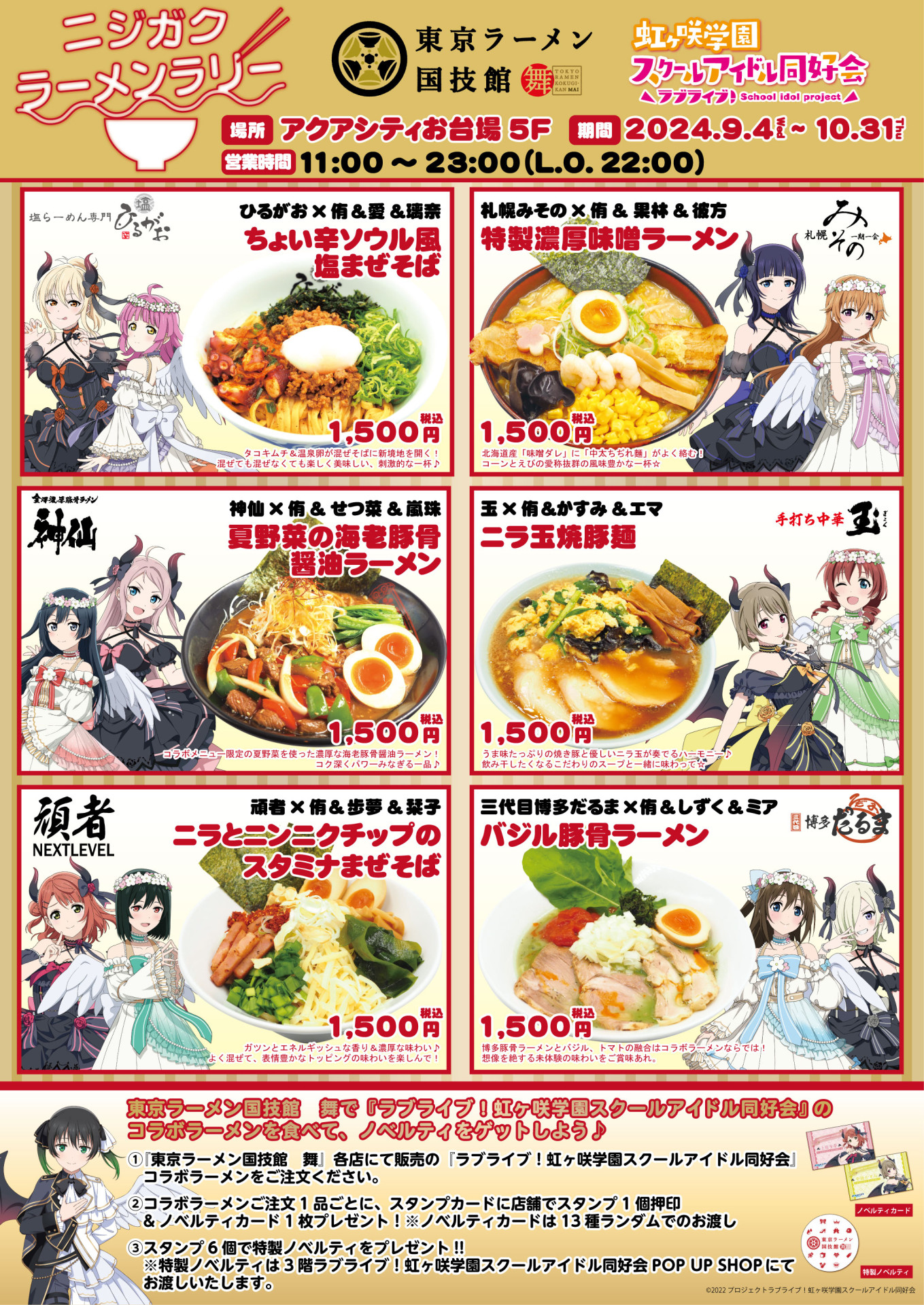 ・『東京ラーメン国技館 舞』各店にて販売の上記コラボラーメンをご注文1品ごとに、店舗でスタンプ1個押印&ノベルティカード1枚(全13種)をランダムでお渡しいたします。