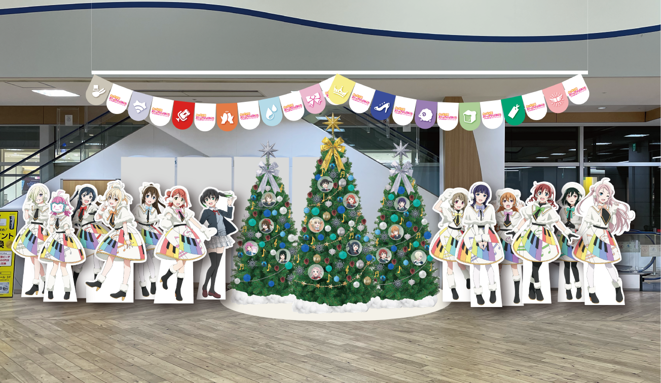 期間中、シーサイドモール3階のデックス広場(インフォメーション横)にオリジナル装飾が施されたカラフルツリーとニジガクメンバーの等身大パネルのフォトスポットが登場します。