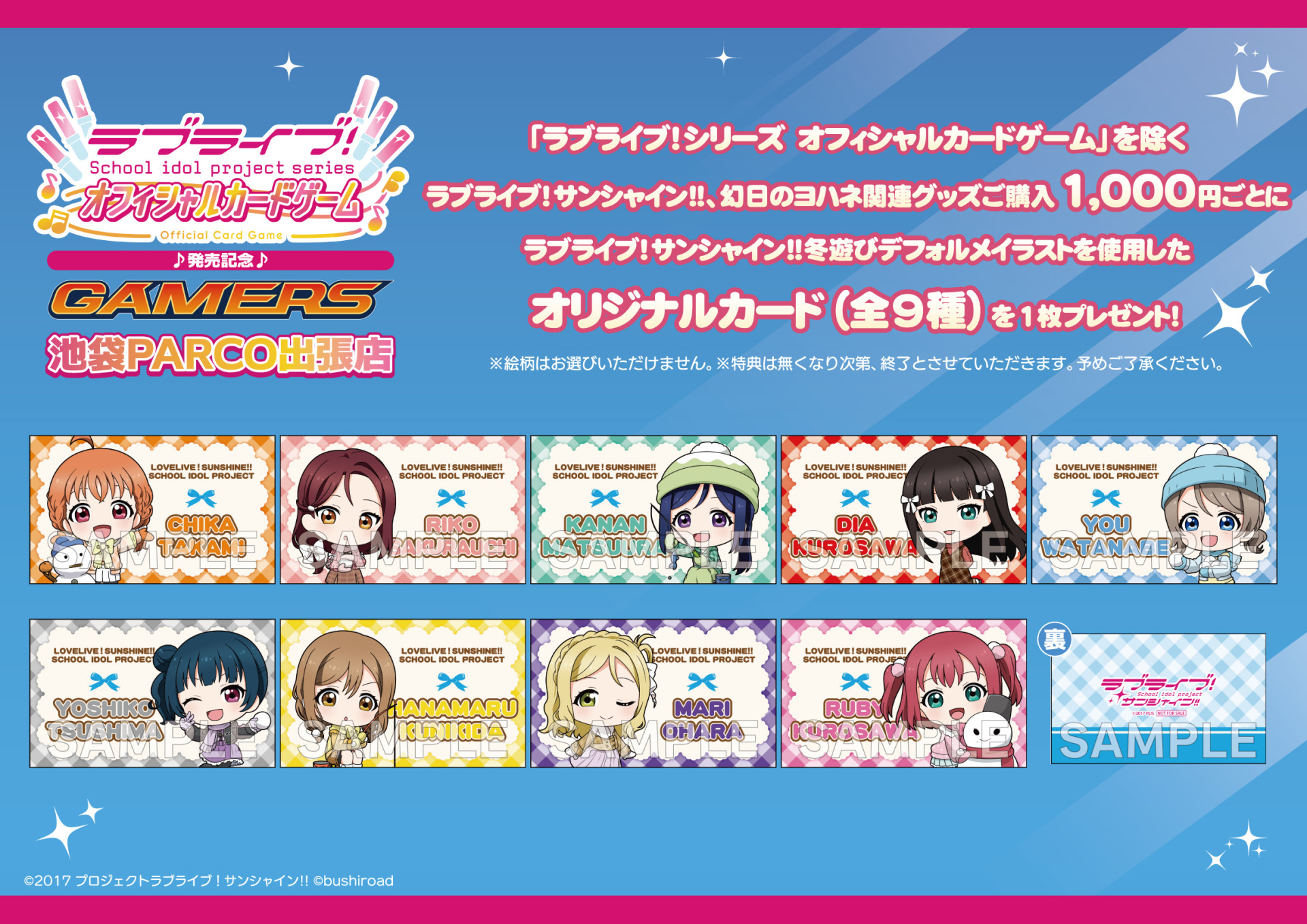 ※「ラブライブ!シリーズ オフィシャルカードゲーム」発売記念ゲーマーズ池袋PARCO出張店は他ゲーマーズ店舗並びに通販の特典対象外店舗となります。先攻後攻カードの配布対象店舗ではございません。